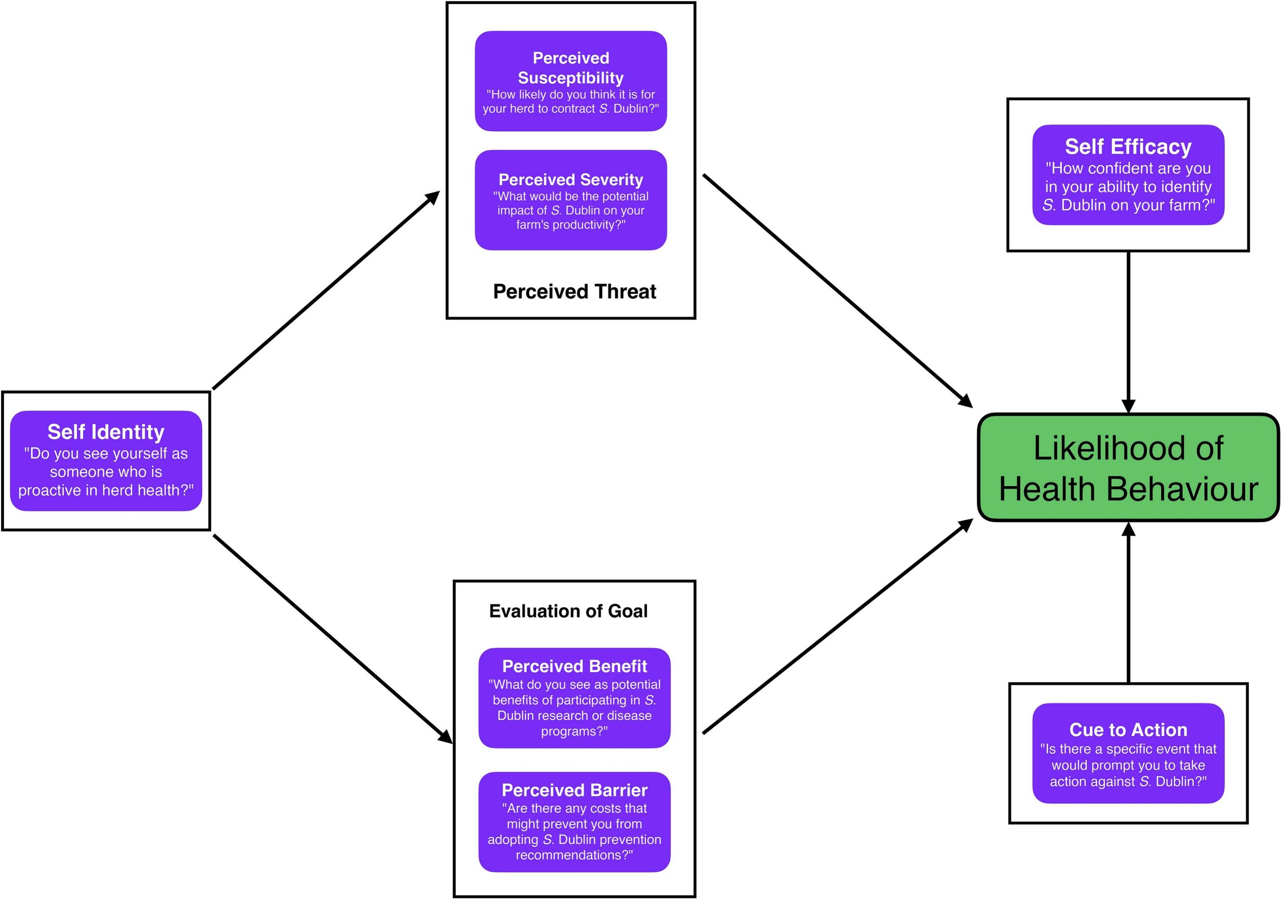 The Health Belief Model explores how key concepts interact to determine the likelihood of a person undertaking a health behavior. Specifically, the model holds that a person's perceived susceptibility and severity explain their perceived threat of an issue and subsequently the motivation to respond to the threat; perceived benefit and perceived barriers determine how one evaluates a goal (preventing disease), and subsequently their willingness to respond; cue to action and self efficacy evaluate an individuals likeliness of responding to a threat, and finally, self identity can function as a modifying factor that influences all other variables. Sample questions that correspond to each concept demonstrate how this can be used to investigate S. Dublin.